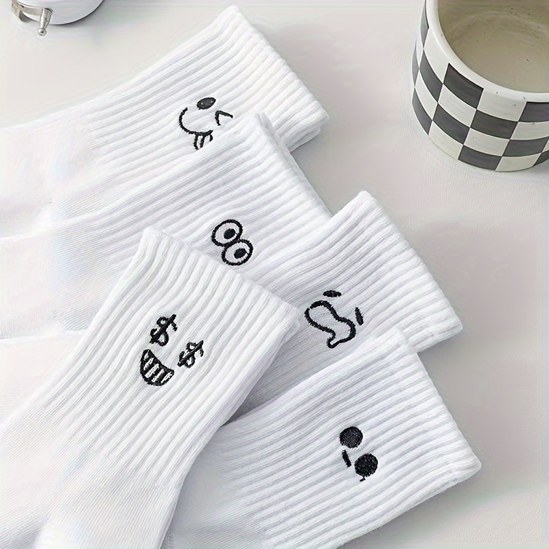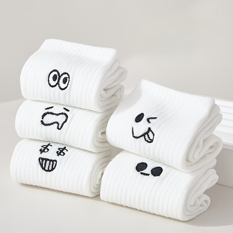 5 Pairs Of Women’s Short Socks, White Casual Mid-Tube Socks With Quirky Expression And Little Eye Embroidery, Couple Long Socks, Odor-Resistant Breathable All-Season Socks, Cartoon Sports Wear